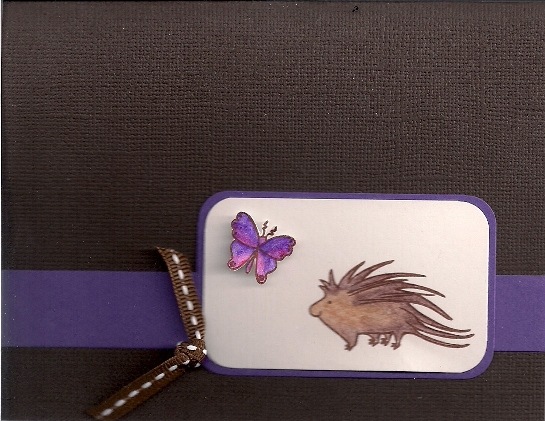 I have to admit that I didn’t come up with the concept for this card on my own. I had a little help from my friends at the local stamp store. I hope they don’t mind when I feed off their creative energy.. I did spend a good 6+ years working there! Anyways, I didn’t steal everything from the original. I used purple instead of light blue, went for a different image, and opted out of some brads, cuz hey, I’ve got to make it my own somehow. As for the cute critters, I’ve had that set for quite some time. I think it was a birthday present. But is that a porcupine, or a guinea pig? Beats me! Thoughts?