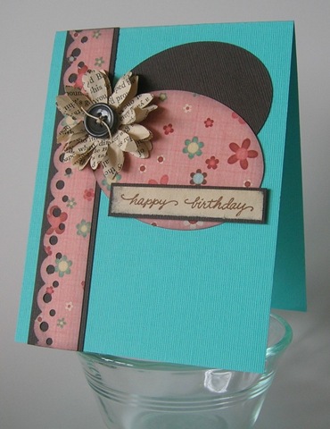 The border piece is from one of my favourite Martha punches. For the flower, I used a punch to punch out 5 layers from an old book. The “happy birthday” sentiment is also stamped on that book paper. I really had fun with this card! And I love love love making those book-paper flowers. I’m sorry to say that I don’t have any WPlus9 stamps yet, so I couldn’t work with any in this card.