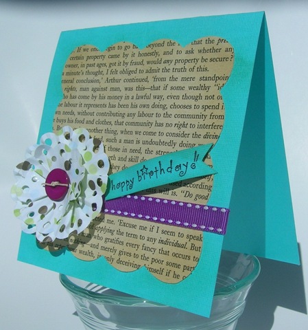 I used one of those fantastic eyelet punched paper flowers and some beautiful ribbon that I picked up yesterday at Michaels. I love this vintage book background. I’m trying to find ways to use book text in all my cards. I’m just that obsessed with it.