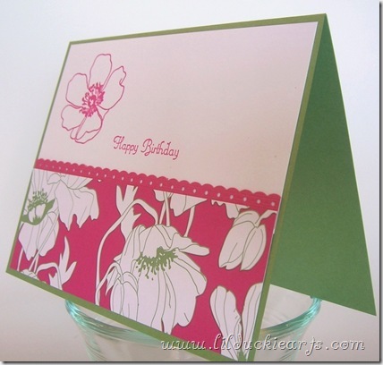 Everything about this card makes me smile. The colours, the gorgeous flowers, the little lacy scalloped trim.. I’m liking it.
