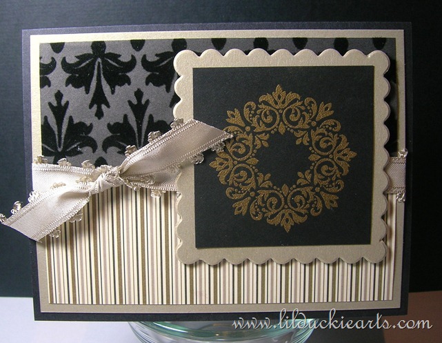 So this card is a complete copy (2 minor changes) of one that I received from a fellow Stampin’ Up! Demonstrator at a swap. Thanks, Petty! She’s super talented. Her version had a different stamped image, and instead of the ribbon, she’d used gold waffle paper.