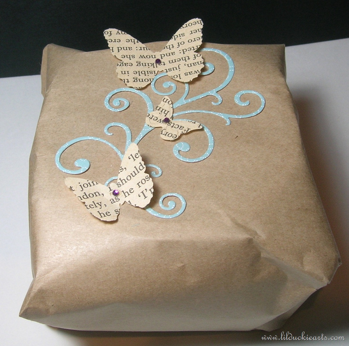 I just wrapped it up in some kraft paper and decorated it up. I’ve used a Fancy Flourish Die-namics die from My Favorite Things, out of some Stampin Up! Designer Series Paper. 2 of the butterflies are from Martha Stewart punches, and the smallest one is from the Stampin’ Up! Beautiful Wings die. I just cut them out of a book of fairy tales and added some little purple gems.