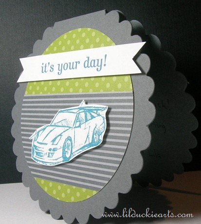 I really like the circle here. I felt like Nathan needed a little something different – a step away from the regular 4 1/4” x 5 1/2” card. So I folded up the usual card base and ran it through the Big Shot, using the large scalloped circle die, but moving it in a bit so a few scallops were missed (that’s the fold). Add the car, the sentiment, some DSP, and you’re done!
